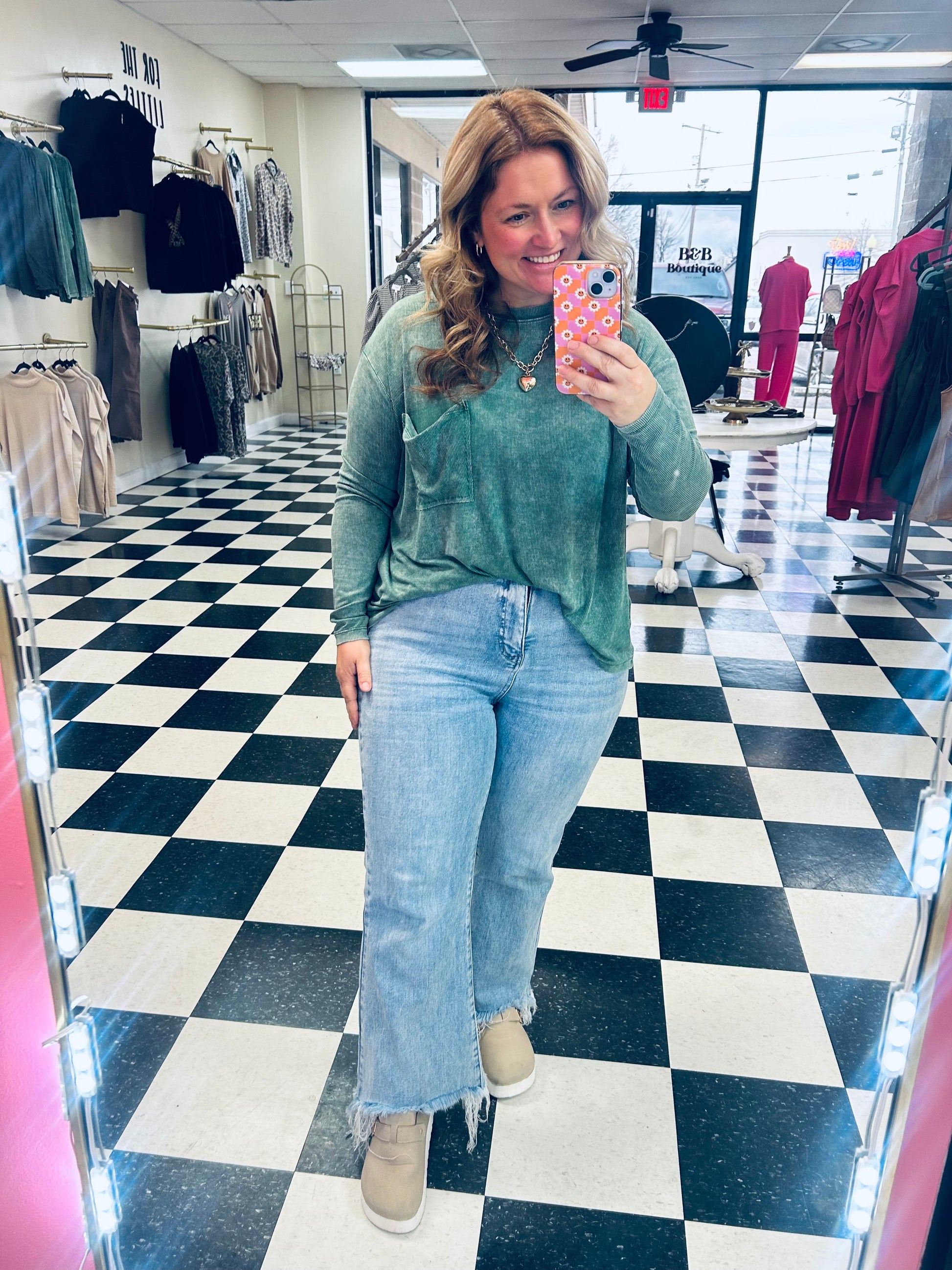 One of our all time best selling jeans now comes in aNON distressed style! So many of you have requested this same style with no knee distressing...so voila! These jeans Features a crop flare style, raw ankle hem. High rise waist