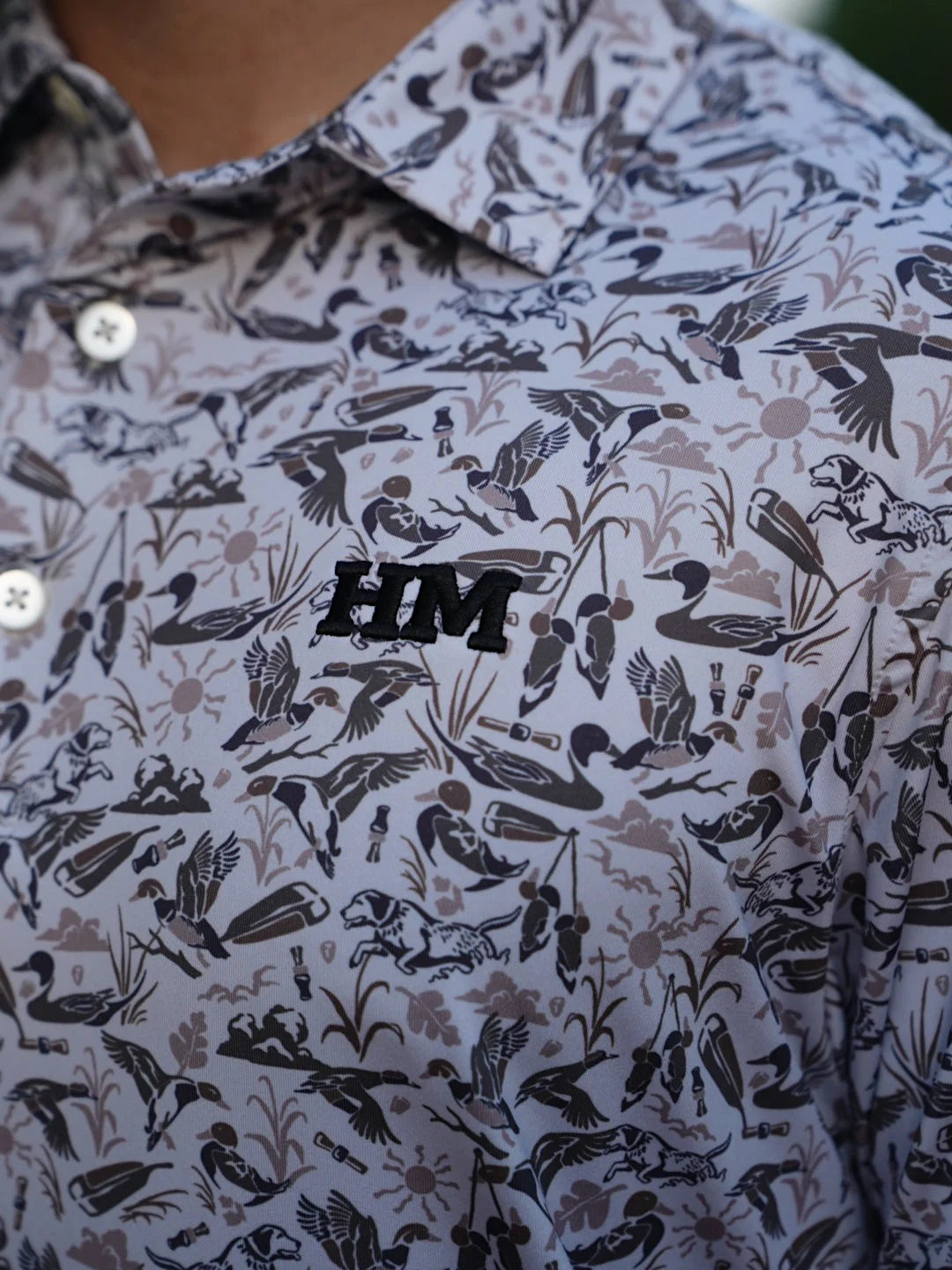 The Duck Club performance polo is a wardrobe essential for any duck hunter. When it's time to hang up the camo for a more classic look, this performance polo has your back. This classic design features all the things that cross a duck hunter's mind from duck calls, a labrador retriever, decoys, pintails, wood ducks, mallards, and more. With its four-way stretch, UPF technology, moisture-wicking capabilities, & anti-microbial features, this polo is ready for any adventure or even a casual night out.