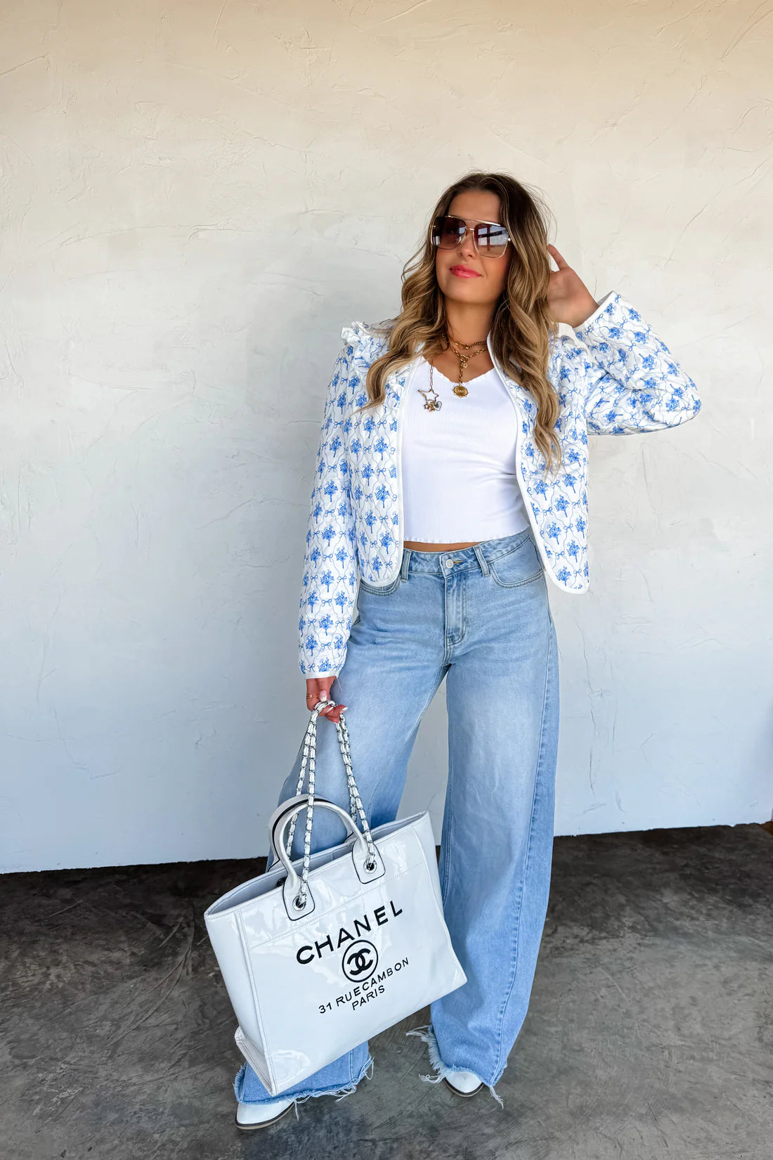This cropped jacket features a structured, collarless silhouette with a subtle quilted texture and an allover blue floral and bow print on a crisp white background. The open front design makes it easy to layer, while the tailored fit adds a polished, feminine touch. Lightweight yet eye-catching, it’s the perfect statement piece to elevate any outfit from denim to dresses.