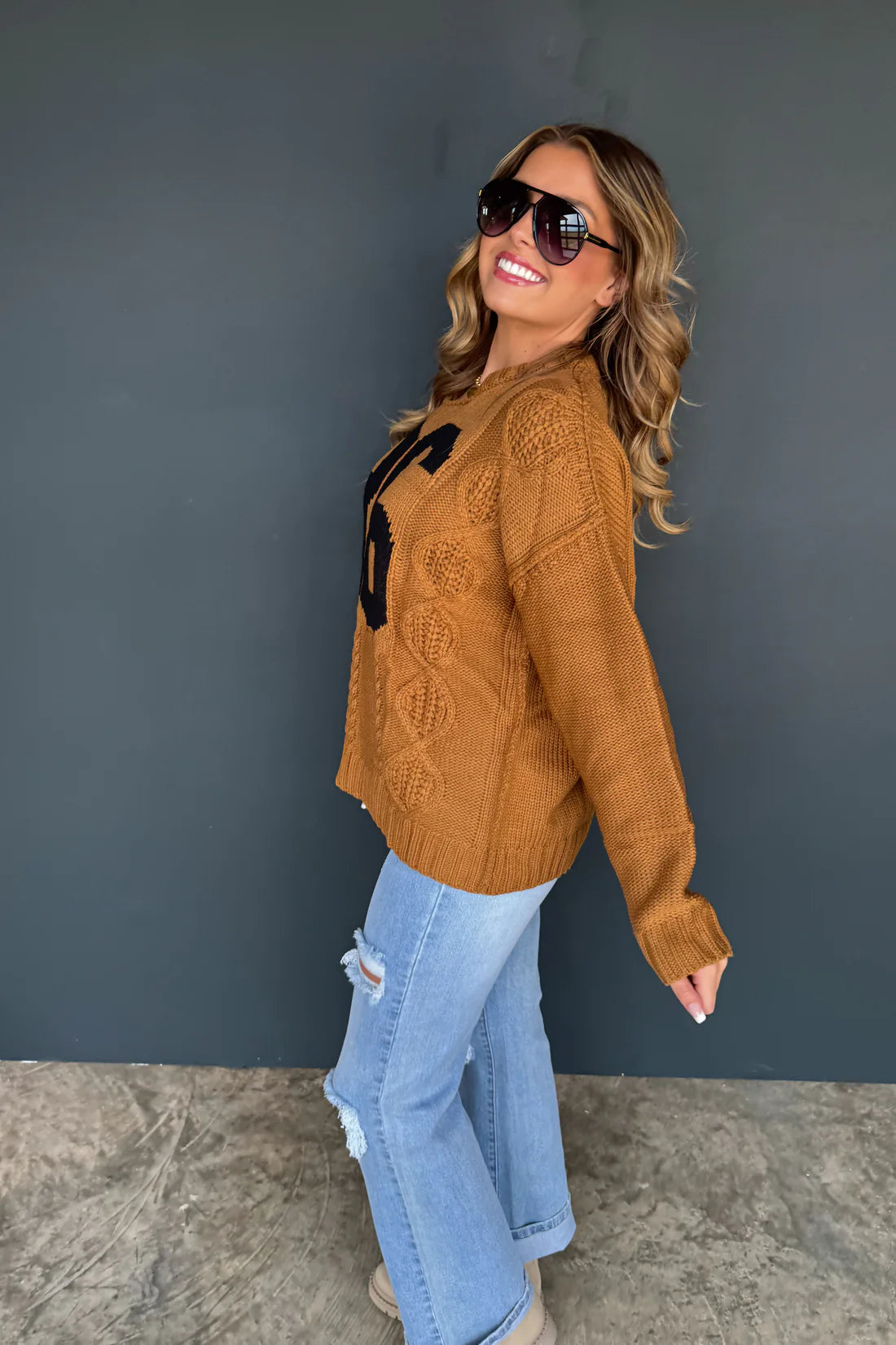 This bold knit sweater is the ultimate statement piece for game day and beyond. Featuring a chunky cable knit design with a large “86” graphic front and center, it brings a sporty, vintage-inspired vibe. The relaxed fit and cozy knit make it an easy throw-on with jeans, cargos, or skirts.